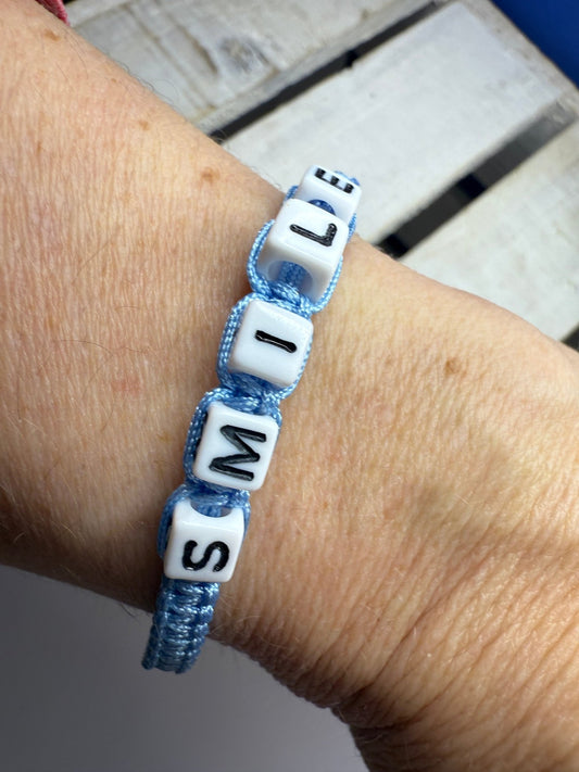Smile Bracelet – Light Blue Woven Beaded String Bracelet with Letter Beads, Adjustable Friendship Jewelry