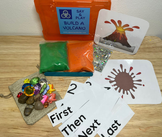 Volcano and Dino Play VOLCANO Play Sequence Kit – Volcano Playdough Cup – Speech Therapy Language Kit – Educational Mini Objects for Kids – Sensory Play STEM Activity Kit Language Task Box - Dino Play