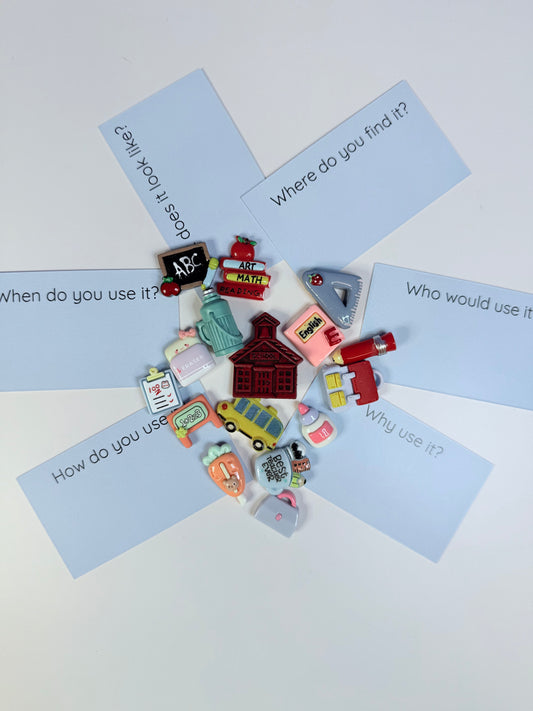 SCHOOL theme Mini Objects with Question Cards- Theme Trinkets Speech Therapy