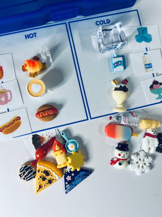 TEMPERATURA CIENCIA Preescolar Ordenar Caja de Tareas Fría Caliente con Mini Objetos e Imágenes - Objetos en Miniatura - Caja de Tareas de Terapia del Habla