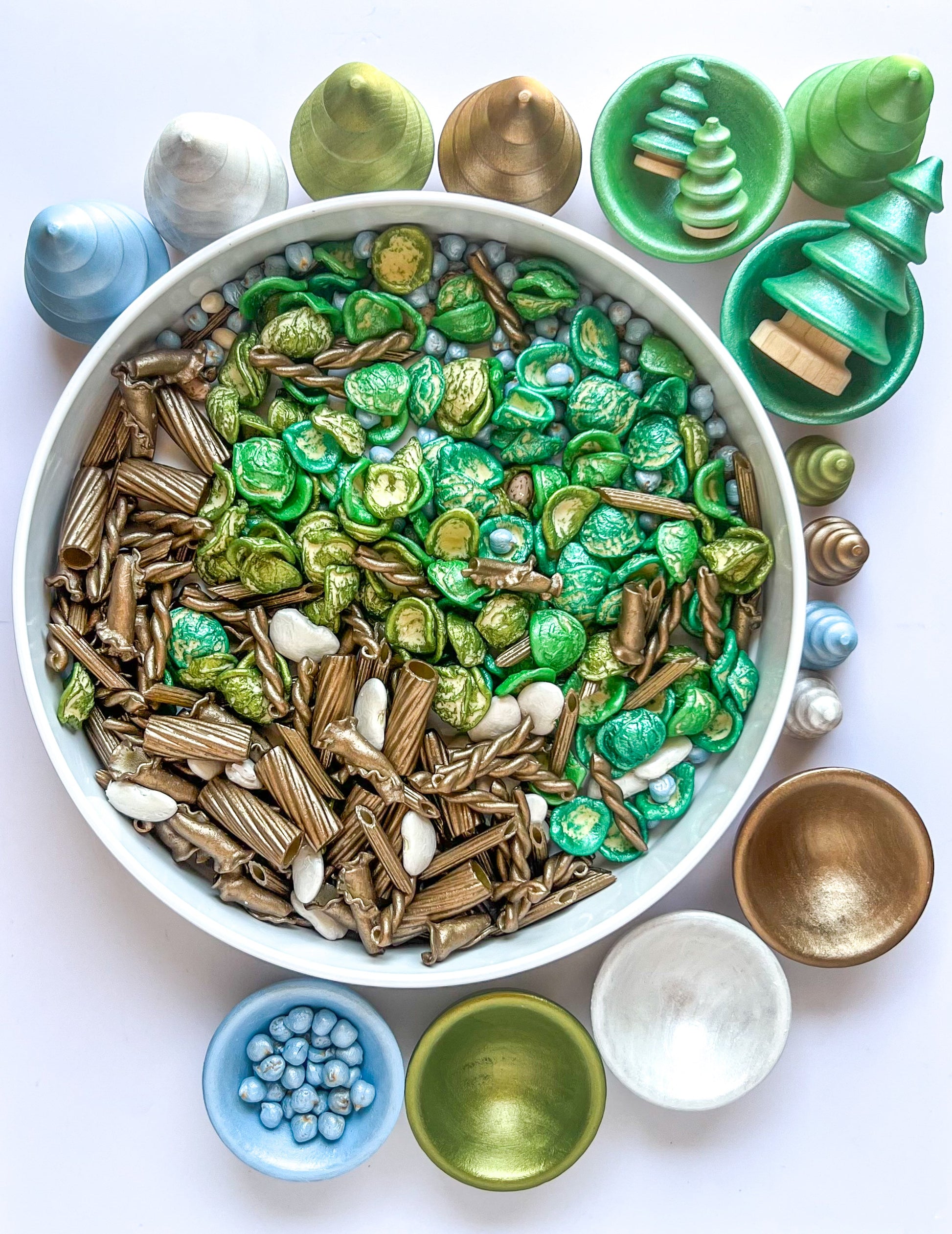 Create and play with our best-selling sensory play filler! This pasta mix features gorgeous colors and textures perfect for your little explorer. Check out coordinating hand painted wooden accessories for even more hands-on fun! Play Bundle includes 4 bowls, 4 trees, and 4 mini trees.
