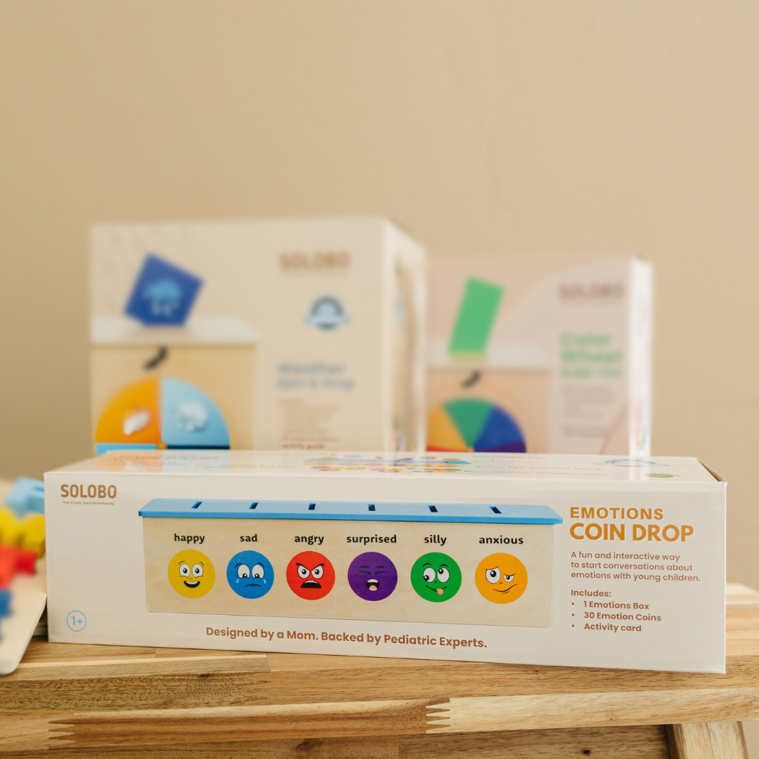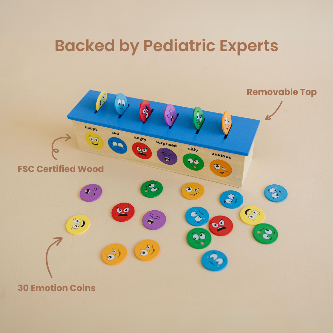 The Emotions Coin Drop is a Montessori-inspired wooden toy designed to help children explore and express their emotions in a fun, interactive way. This educational toy features six different emotions printed on the front and includes 30 matching wooden coins, making it a great tool for building emotional intelligence through play.