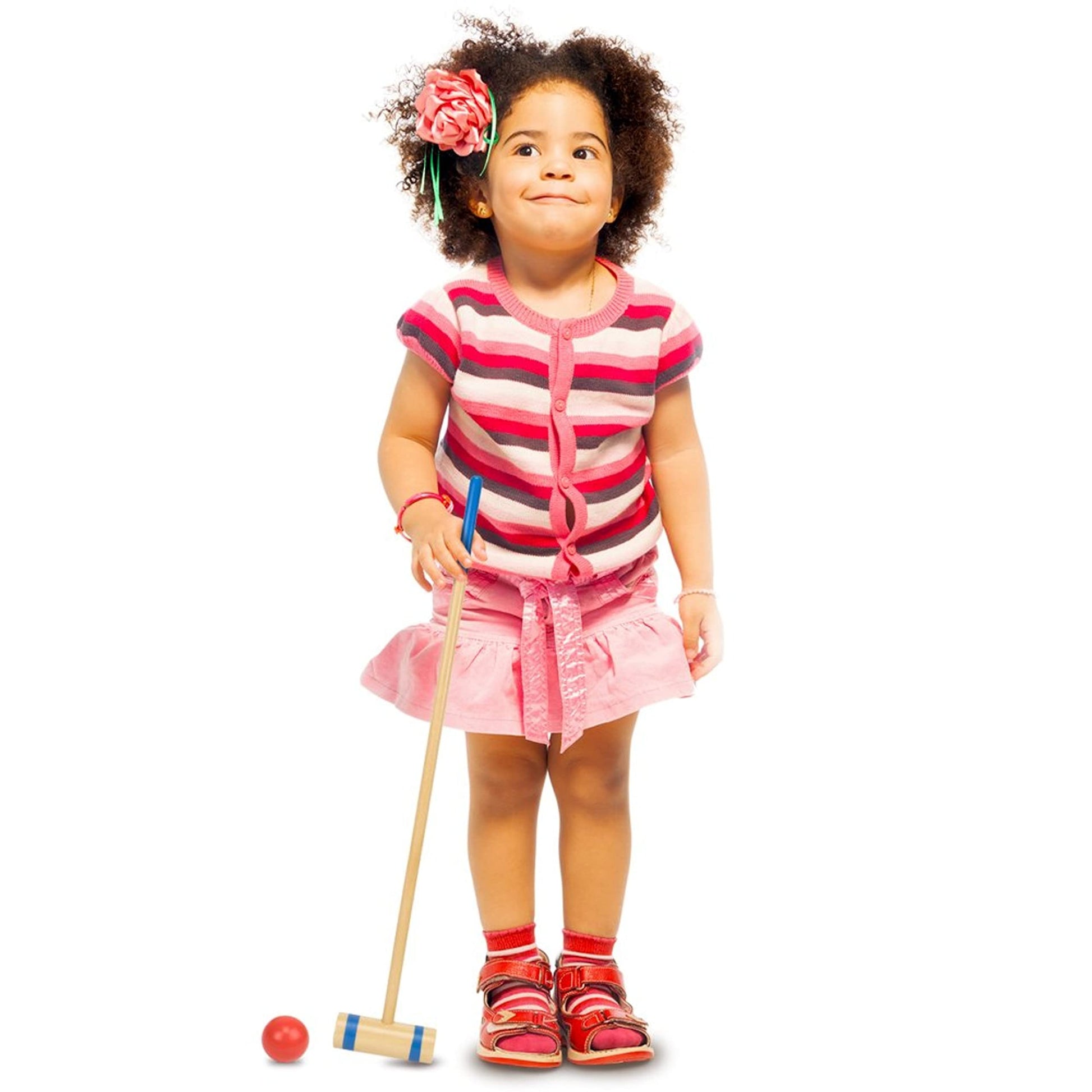 Round up the herd and grab a mallet! Little ones will have a wild time with this wooden croquet set. It comes with two mallets, three balls, and six jungle animal wickets: Lion, Monkey, Hippo, Elephant, Giraffe, and Zebra.