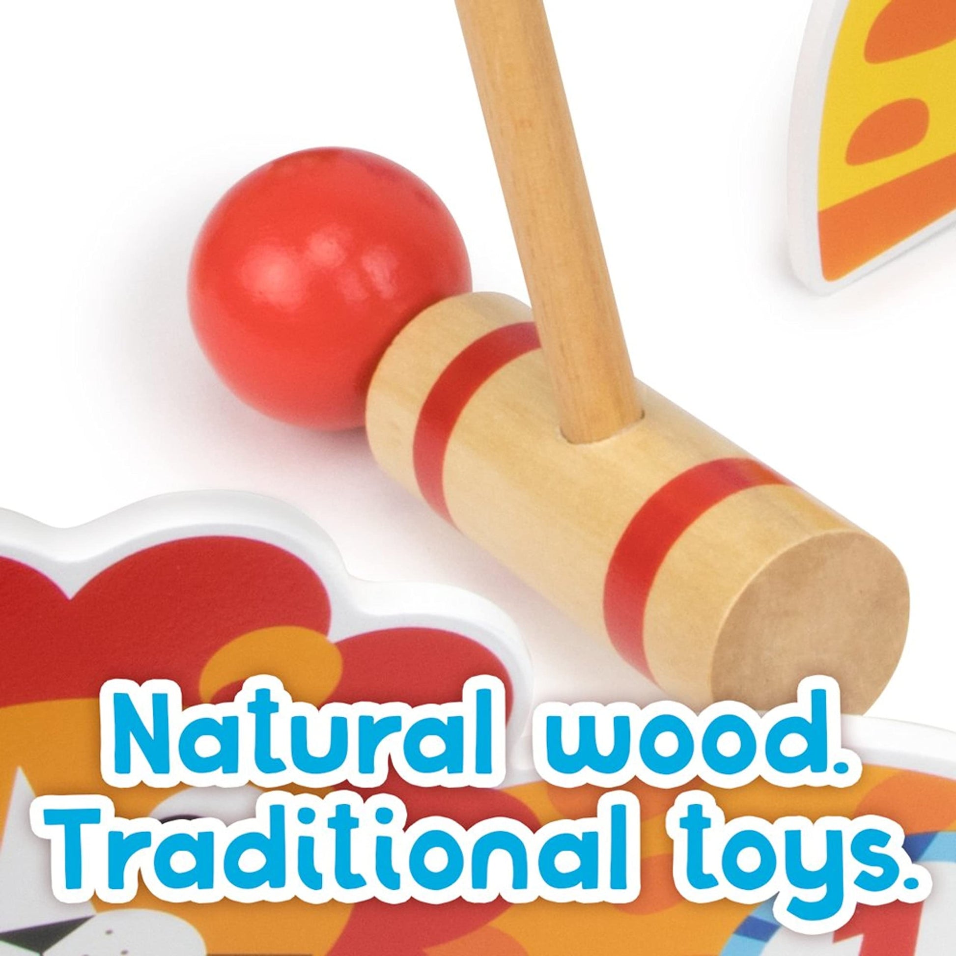 The best part? It's customizable! Place the wickets in a line, or make a shape. Place them close, or far away. Once you're all set, use the mallet to hit the ball under each animal until you reach the end!