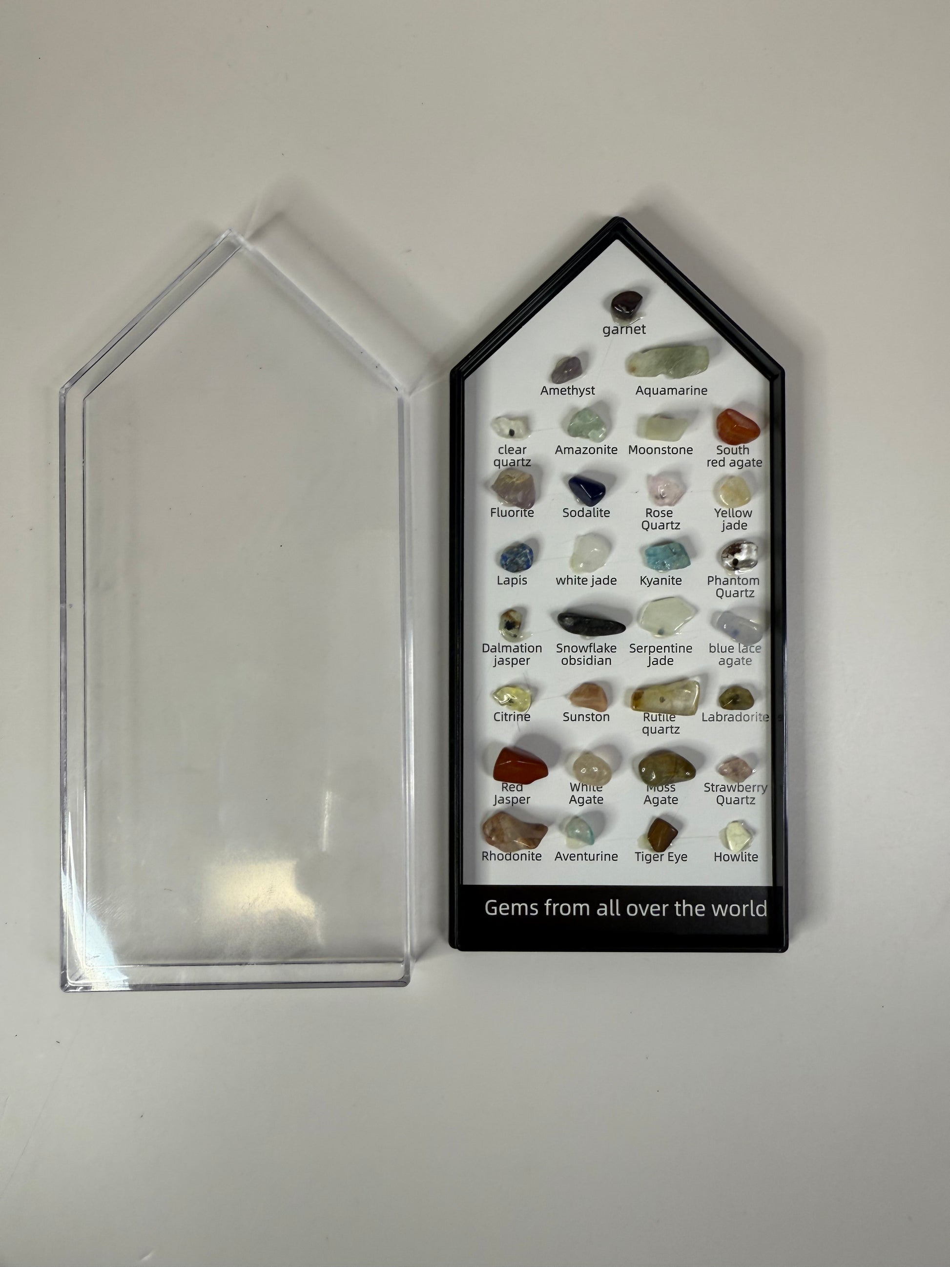 This compact, house-shaped display features 20+ real gemstones from all over the world. Each stone is mounted and labeled, creating a tactile and visual guide that’s perfect for curious learners, collectors, or therapy sessions.