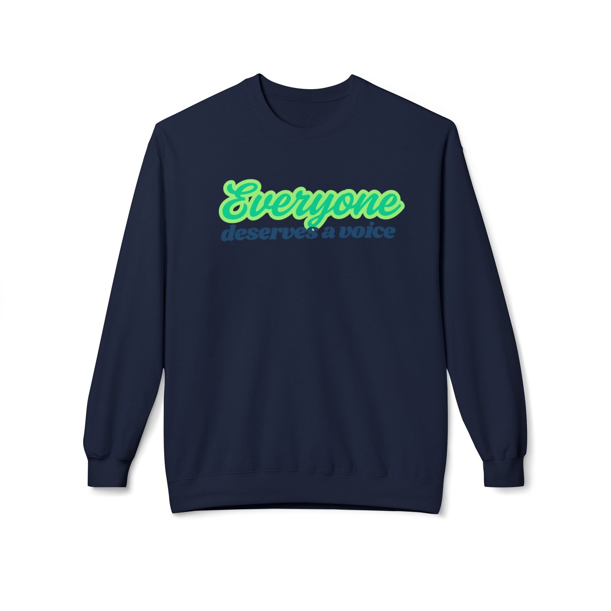 A Speech Therapy Sweatshirt with the quote 'everyone deserves a voice' on the front, making it a perfect gift for Speech Language Pathologists. This cozy and comfortable sweatshirt is designed for a relaxed fit, featuring dropped shoulders and ribbed cuffs. It is ideal for casual wear and brings a positive and empowering vibe to the wearer's life. Perfect for celebrating Speech Therapy Awareness Month.