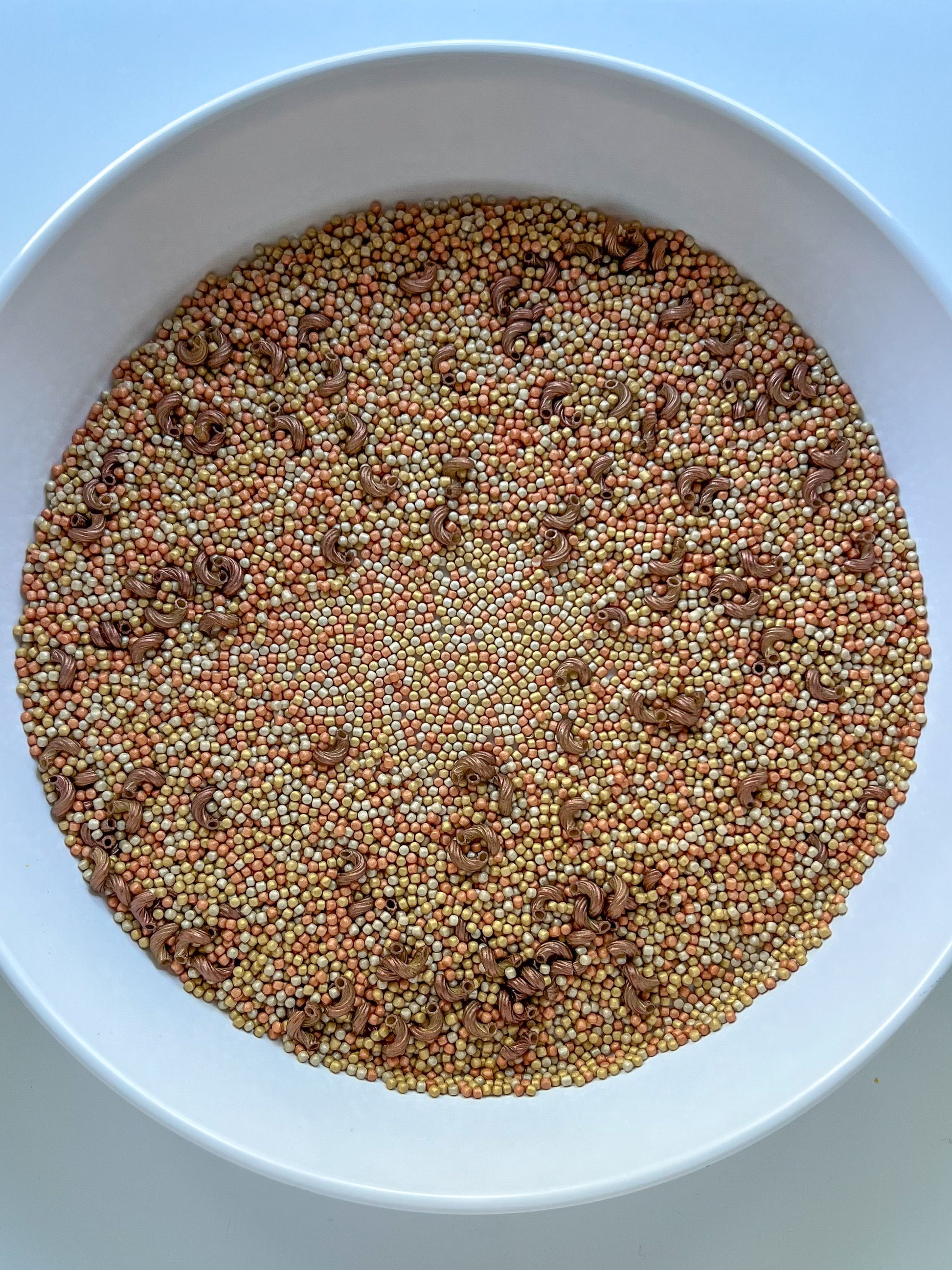 This filler comes in two material options - couscous is the small round filler and can be a little bouncy and unruly. It’s very fun and such a unique play experience but it can be harder to manage than other shapes. Don't let me sway you from trying it out, I just don't want anyone to be dissatisfied. The rice and barley mix is perfect for using with the Say & Play Dino Minis!
