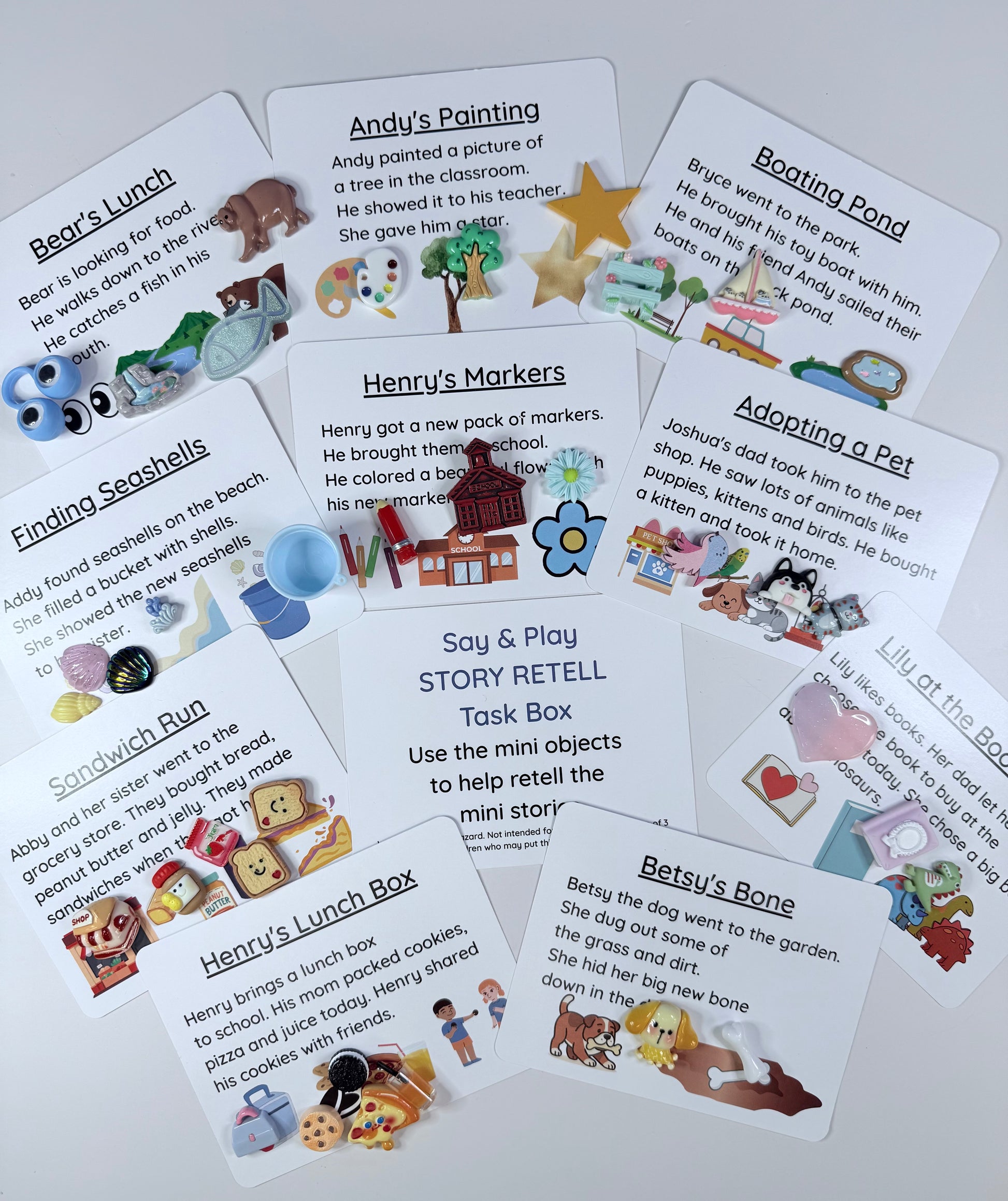 8. Story Recall – 10 Double sided short story cards + 35 mini objects to support answering questions
